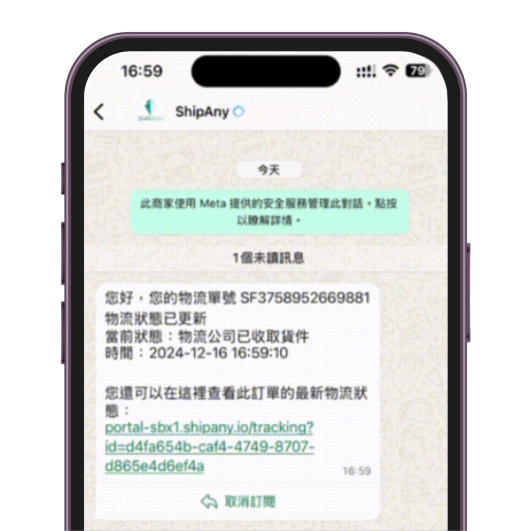 - 客人亦可以於「送貨方式」頁面選擇訂閱ShipAny,獲取即時Whatsapp運送狀態更新通知